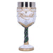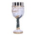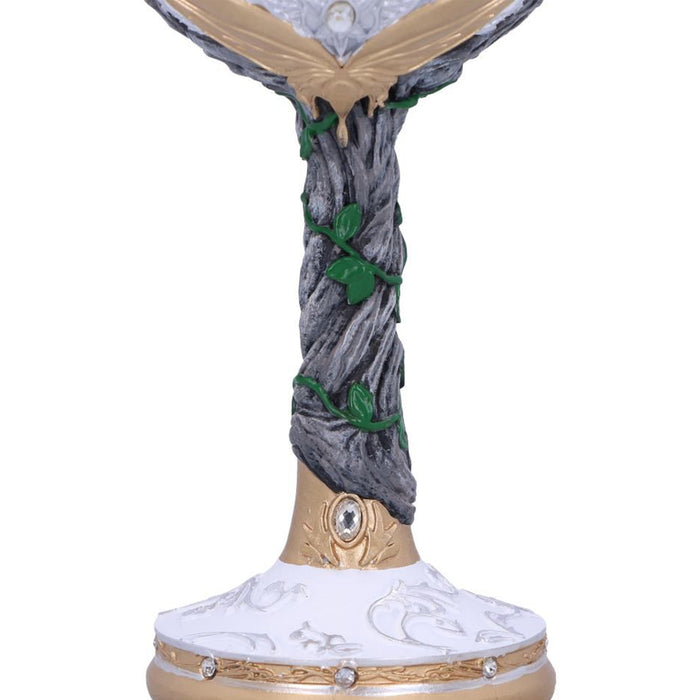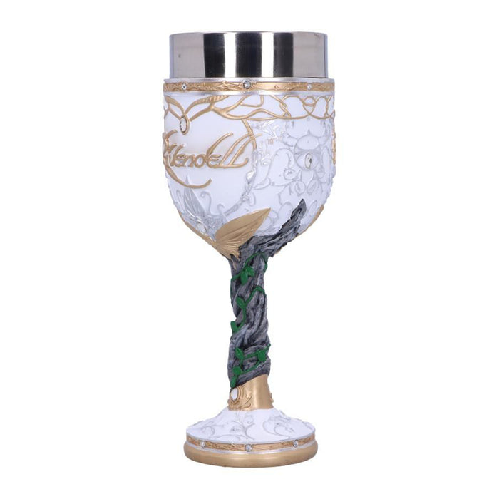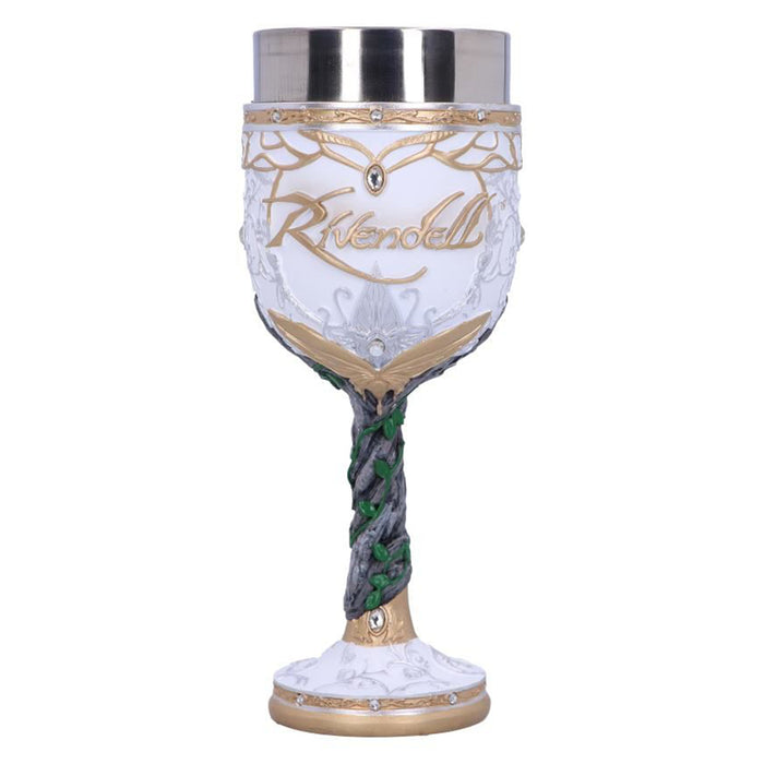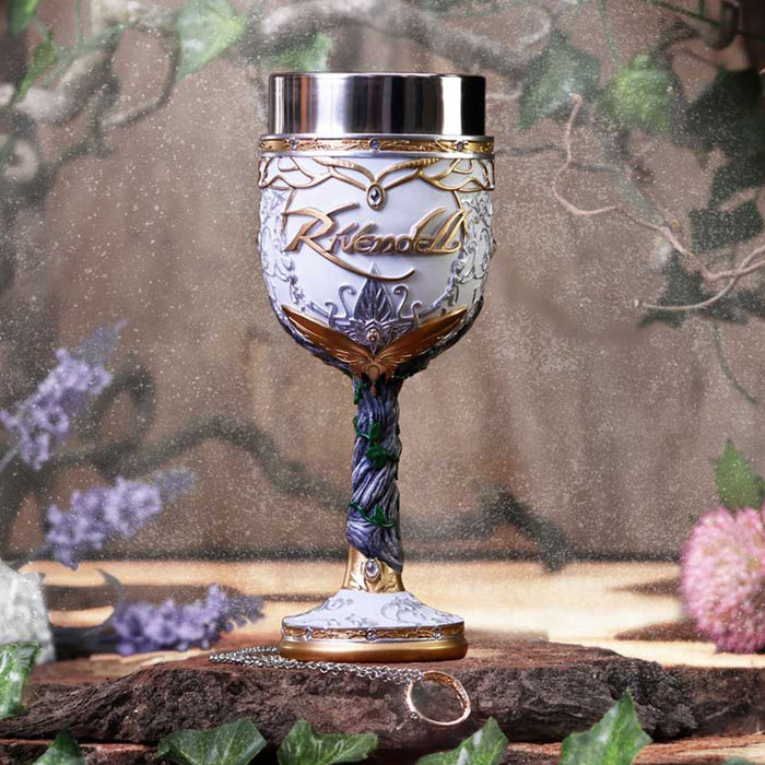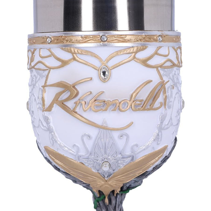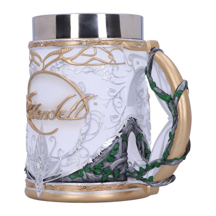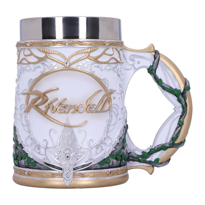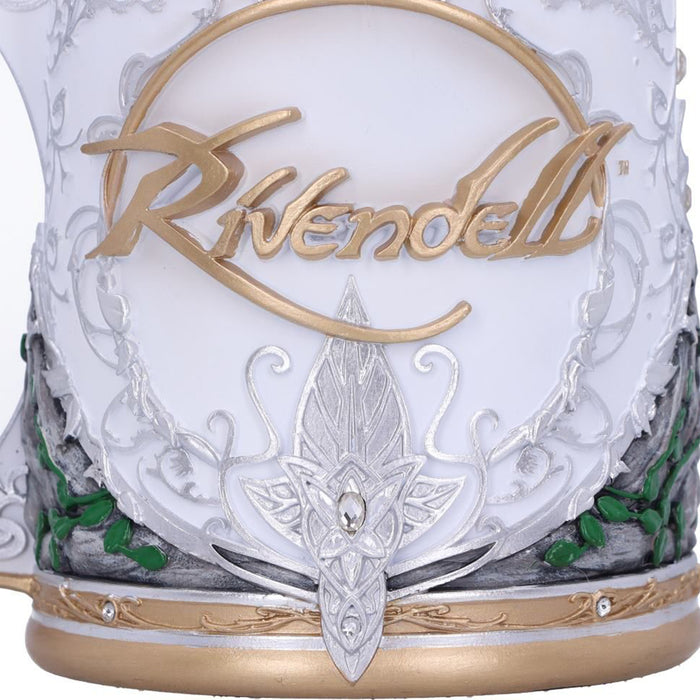 • The companions met for the first time in Rivendell. This place has a very special meaning for Aragorn, as it is the home of his beloved Arwen. Her crown, evening star and Lórien leaf therefore adorn both the wine goblet and the beer mug. Both vessels are gleaming white with golden decorations, set with several small jewels and the words "Rivendell", which translates as Rivendell. Plants climb up the handle or stem, illustrating the Elves' connection with nature.