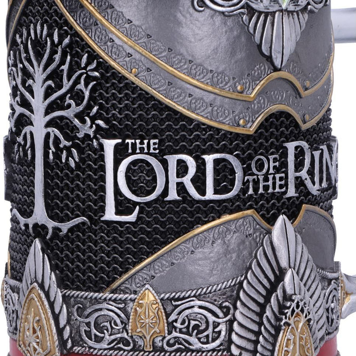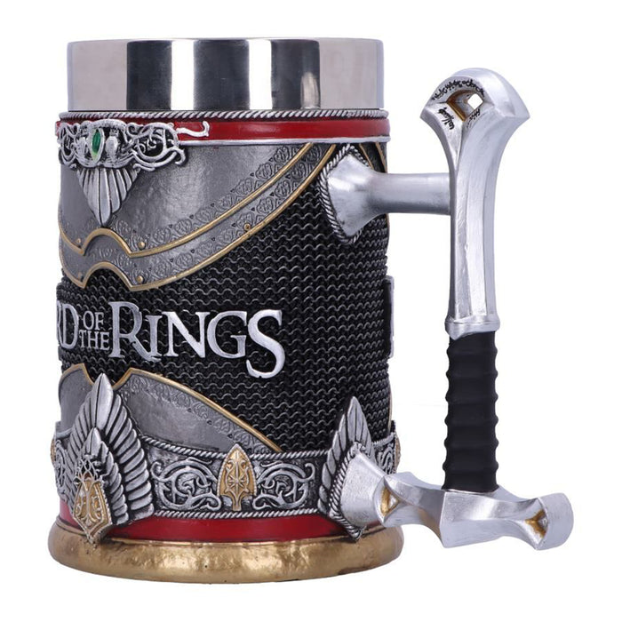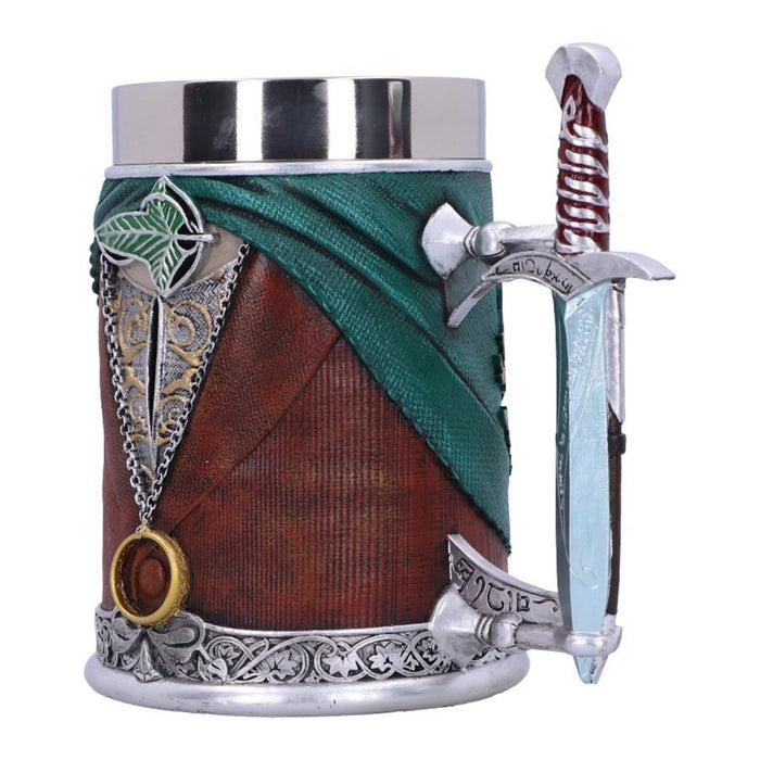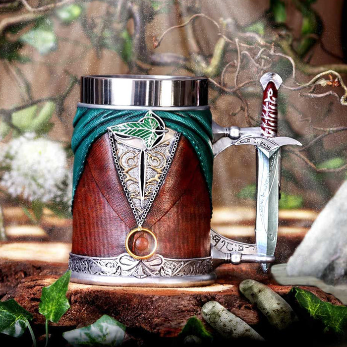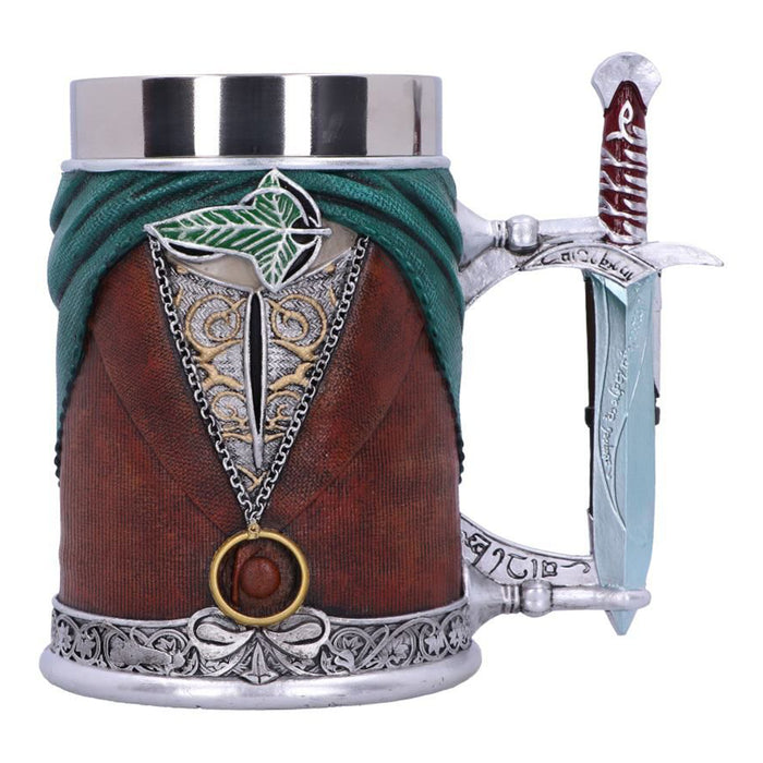 • It's best to drink with good friends. Despite initial tensions, some of the companions have even become best friends. This is especially true of Aragorn, Legolas and Gimli. The artistically crafted beer mug, which is also adorned with the "Lord of the Rings" lettering, shows the clothing and preferred weapons of the three warriors.