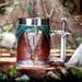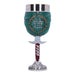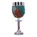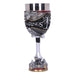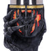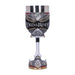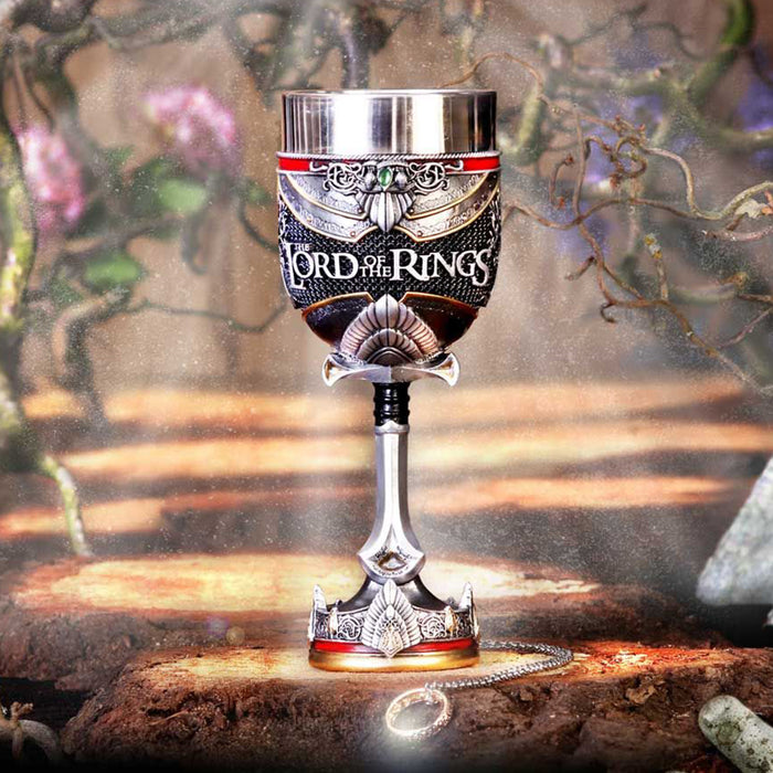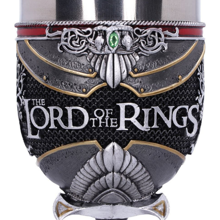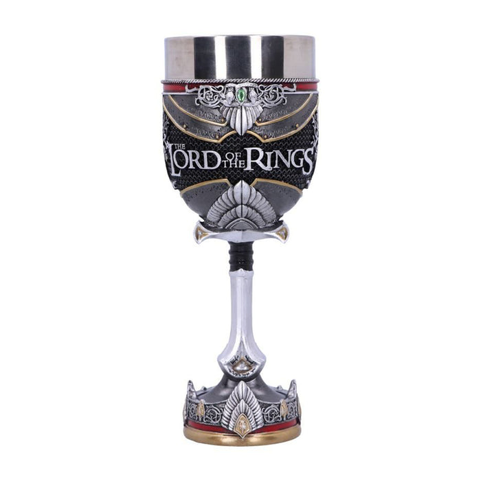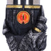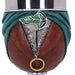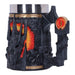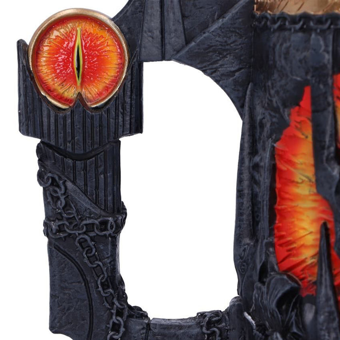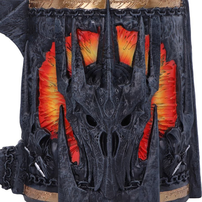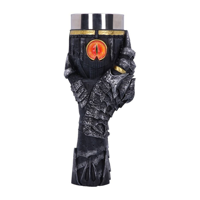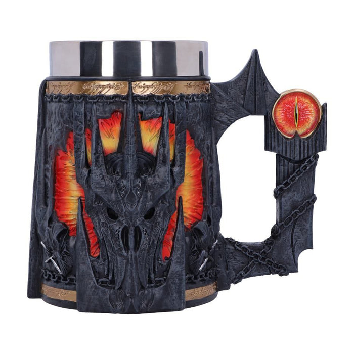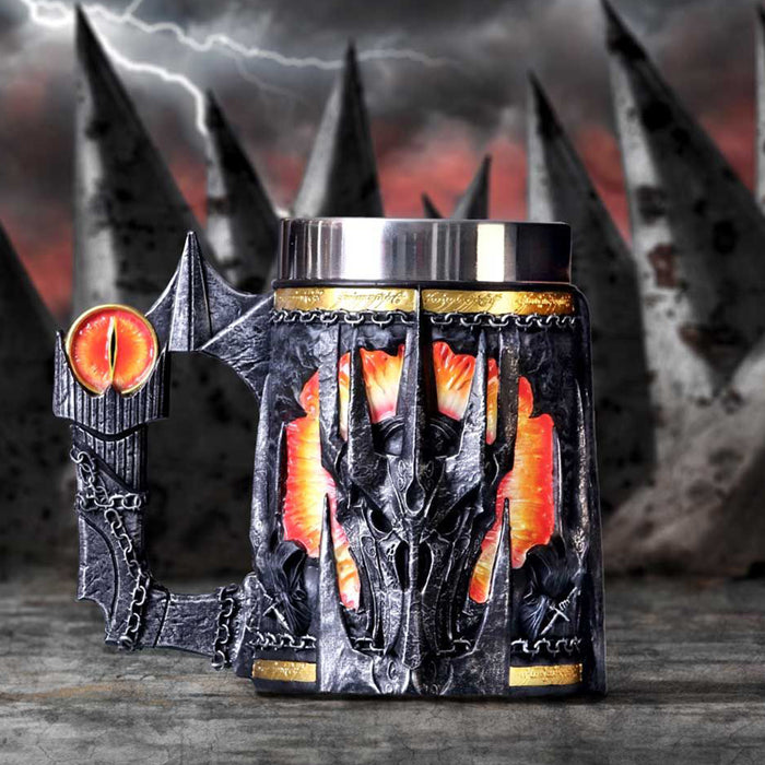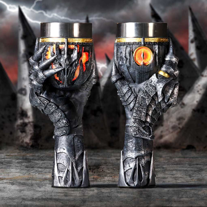 • Even though he was the evil one in the story, Sauron and his lidless eye on the tower of Barad-dûr still exerted a certain fascination. That is why he is immortalized in a beer mug and a wine goblet. The inscription of the One Ring is immortalized on both, as well as the Helm of Sauron. The wine goblet is held by his own hand, the One Ring still on his finger. The handle of the beer mug, on the other hand, consists of the Tower of Barad-dûr, on which the fiery eye is emblazoned and closely monitors your drinking habits.