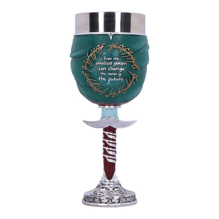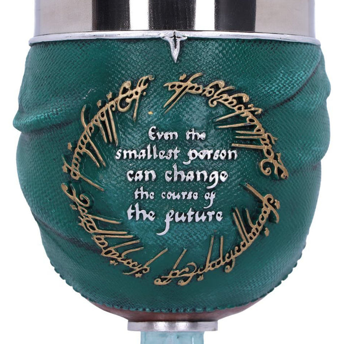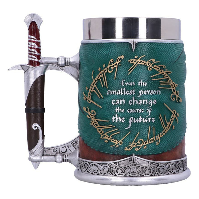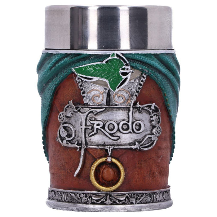 • The greatest honor is of course due to the ring bearer, Frodo Baggins, who was ultimately able to destroy the ring with the help of his best friend Sam. Both the beer mug and the wine goblet are modeled on his clothing, with the Lórien leaf and the ring on the necklace. The handle, or rather the stem, shows Frodo's sword engraving. His coat is adorned with the golden, elvish inscription of the ring and the quote: "For even the smallest person can change the course oft he future."