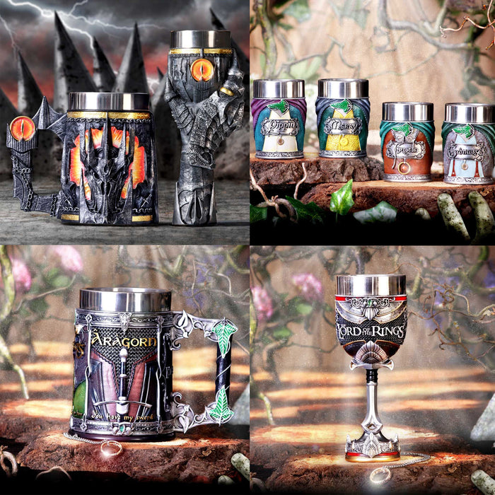• Variants: Frodo beer mug, Frodo wine goblet, Hobbit shot glass set, Sauron beer mug, Sauron wine goblet, Rivendell beer mug, Rivendell wine goblet
