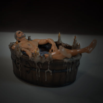 • Die Figur ist nach einem denkwürdigen Moment aus der Eröffnungssequenz des Videospiels modelliert, bei dem Geralt in der Badewanne liegt