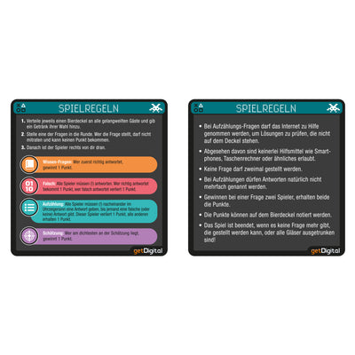 Auf diesen elf bunten Bierdeckeln findest Du neben einer Anleitung lauter Fragen aus den oben genannten Kategorien, in denen Du Dein Wissen unter Beweis stellen kannst. Damit Deine Freunde auch eine Chance haben, sind nicht nur "normale" Fragen enthalten, sondern auch Schätz-, Gruppen- und Aufzählungsfragen. Wenn also bei der nächsten Firmenfeier alle nur betreten zu Boden schauen oder nervös das Etikett vom Bier abfummeln, kannst Du von nun an sofort für gute Stimmung und Spaß sorgen! :)