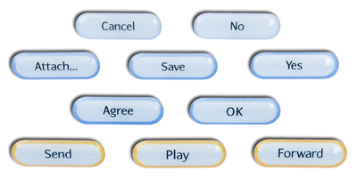 Ein Set besteht aus 10 Pins, wobei die Beschriftungen "Cancel", "No", "Save", "Attach...", "Yes", "Agree", "OK", "Send", "Play" und "Forward" enthalten sind.