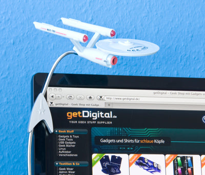 Die Star Trek Webcam ist ein kleines Modell der USS Enterprise NCC 1701, also aus der Originalserie mit Captain Kirk. Ihre Kamera mit 640x480 Pixel, die 30 Bilder pro Sekunde aufnimmt, befindet sich in der Maschinensektion im unteren Teil der Enterprise. Wenn Du die Star Trek Webcam anschließt, zeigen zwei in den Warp-Gondeln rot leuchtende LEDs, dass die Kamera aktiviert ist. Um die richtige Position zum Filmen zu finden, kannst Du die Webcam mit dem biegsamen Schwanenhals auf dem Schreibtisch aufstellen oder mit dem verschiebbaren Befestigungsteil in Form des Starfleet-Logos am Monitor ankleben.