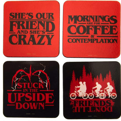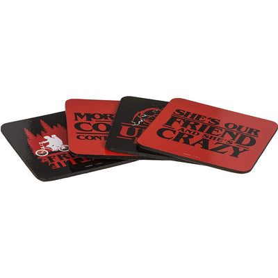 Damit diese anschließend nicht an hässlichen Flecken auf deinem Tisch zerbricht, haben wir dieses Stranger Things Untersetzer-Set für dich. Darauf zu sehen sind die ikonische Motive und Zitate aus der Netflix-Serie.