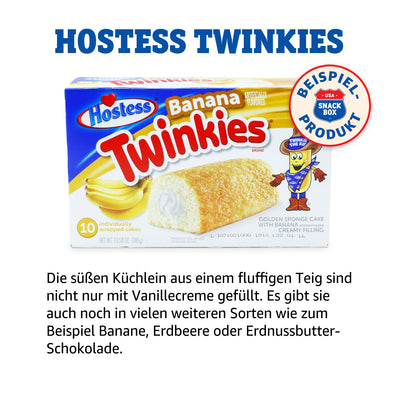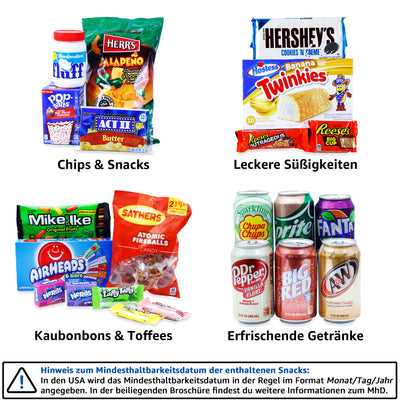 • Enthält u.a. Kaubonbons, Schokolade, Popcorn, Chips, Softdrinks und andere amerikanische Spezialitäten