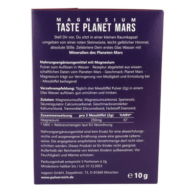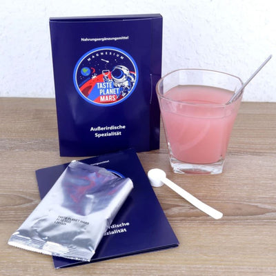 Dieses Mineralpulver besteht nämlich nur aus Bestandteilen, die nachgewiesenermaßen auch auf dem Mars existieren, unter anderem Magnesium und verschiedene Mineralsalze. Es eignet sich bestens dazu, mit Wasser oder anderen Flüssigkeiten gemischt zu werden, wobei im Pulver enthaltenes Eisenoxid dem Getränk eine marsrote Färbung gibt. So kann das Pulver z.B. für den farbenfrohen Cocktail "Mars Rendezvous" verwendet werden, für den du nur etwas Sekt oder Mineralwasser sowie Blue Curaçao-Sirup hinzufügen musst. Natürlich kannst du dir mit diesem interstellaren Nahrungsergänzungsmittel auch deine ganz eigenen Getränke-Kreationen ausdenken! Solche marsianischen Getränke sehen jedenfalls nicht nur gut aus, sondern können durch das enthaltene Magnesium auch dazu beitragen, Müdigkeit zu verringern.