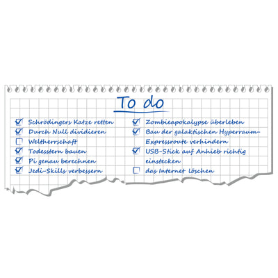 Falls Du allerdings gerade keine Idee für eine zünftige To-Do-Liste hast, kannst Du einfach den To-Do-Becher als Ersatz präsentieren. Auf diesem Keramikbecher findest Du die Liste aller Listen: Der Ersteller hat bereits einen Todesstern gebaut, durch Null geteilt (!) und sogar einen USB-Stick auf Anhieb richtig herum eingesteckt! Eine Liste, sie alle zu knechten, sie alle zu finden, ins Dunkel zu treiben und ewig zu binden... ;)
