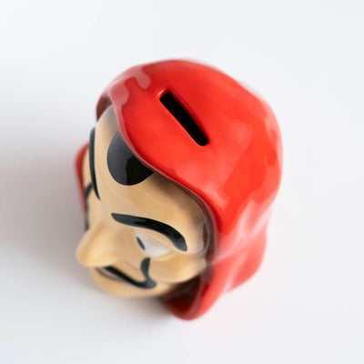 Pero afortunadamente, el ridículo título en inglés no cambia nada de la calidad de la serie, ni tampoco el hecho de que la hucha de "Casa de Papel" se ve increíblemente genial! A partir de ahora, puedes guardar tus monedas en una cabeza de cerámica que, al igual que los personajes principales de la serie, lleva una máscara de Dalí. Para sacar el dinero no necesitas robar un banco, simplemente quita el tapón en la parte inferior. ;)