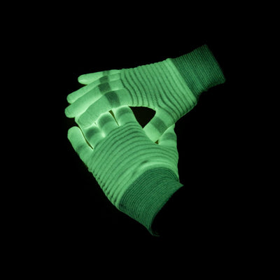 Diese bei Tageslicht unscheinbar weißen Handschuhe können im Dunkeln grün leuchten und sind so auf jeder Party ein geekiger Hingucker.