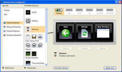 Mediante el Configurador Optimus (que hasta ahora solo funciona en Windows), se pueden configurar fácilmente las funciones y las pantallas, de modo que, por ejemplo, según el programa abierto, se muestre un conjunto diferente de imágenes. Las imágenes propias (jpg, gif, png, bmp) y las ya incluidas se pueden mostrar tanto horizontal como verticalmente.