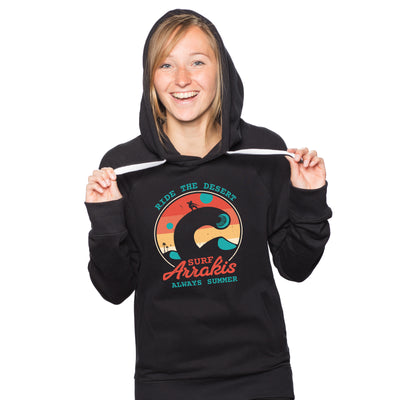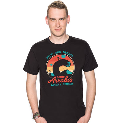 El diseño de la camiseta incorpora elementos típicos de las camisetas de surfistas, que normalmente muestran olas y palmeras, y los entrelaza con el mundo ficticio de "Dune". La frase "Ride the Desert" en lugar de la habitual "Ride the Waves" y el eslogan "Surf Arrakis, Always Summer" hacen referencia al calor eterno y a los interminables desiertos de arena de Arrakis. La impresión general es un homenaje humorístico y estiloso a la historia y temática de "Dune", adaptando hábilmente la iconografía de la cultura surfista a un escenario de ciencia ficción.