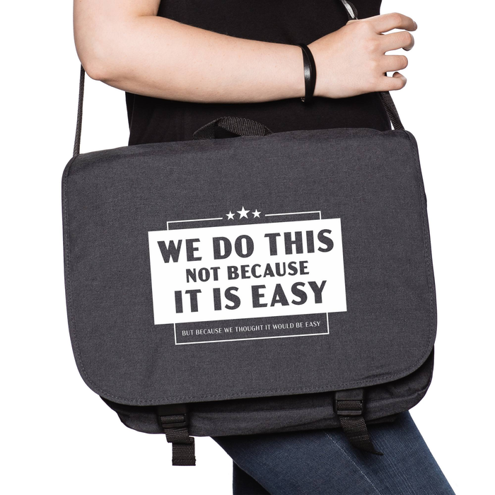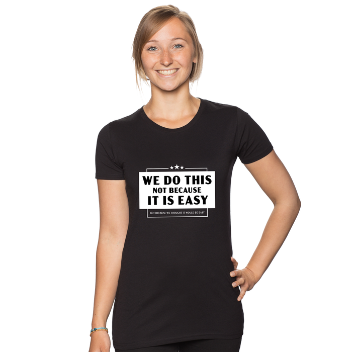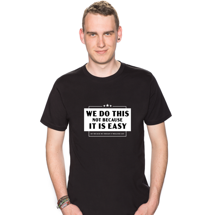 ¿Tú también eres un optimista engreído? Entonces esta camiseta es justo lo que necesitas. Con la ingeniosa frase "Hacemos esto no porque sea fácil, sino porque pensamos que sería fácil", te hará reír y es todo un reclamo. Ideal para cualquier ocasión, ya sea como regalo para amigos que a menudo se ven envueltos en situaciones divertidas o como declaración personal para todos aquellos a los que les gusta presumir de su mentalidad optimista.
