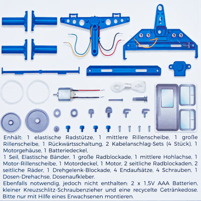 Inhalt: Radstütze, Motorgehäuse, Dosenaufkleber, Schaltung, Batterie-Deckel, Seil, mittlere Rillenscheibe, große Rillenscheibe, Kabelanschläge-Set, Motor, Motordeckel, 2 elastische Bänder, Radblockade, Hohlachse, Drehgelenk-Blockade, Motor-Rillenscheibe, seitliche Radblockade, 4 Endaufsätze, Dosenachse, 2 seitliche Räder, 4 Schrauben, Anleitung
