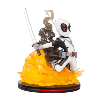 Comme pour la Marvel Deadpool Q-Fig. Pour cette figurine à collectionner de haute qualité, Wade Wilson a revêtu une tenue spéciale datant de ses jours chez X-Force : au lieu du rouge classique, elle brille d'un blanc lumineux. Pour mieux voir les taches de sang. Ou quelque chose comme ça. En plus de Deadpool qui saute vers le spectateur en brandissant deux épées, on peut également voir une réplique d'explosion qui relie le chouchou du public au socle.