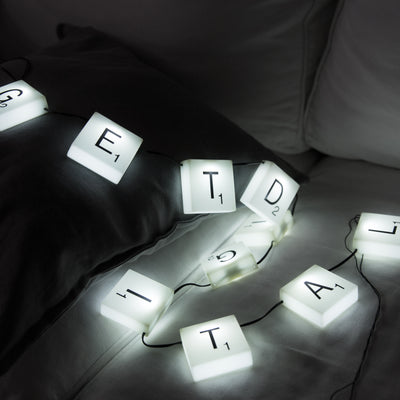 Il ne manque plus que la bonne place pour la guirlande lumineuse Scrabble, qui mesure en tout environ 180 cm de long. A cela s'ajoutent encore 200 cm de câble pour atteindre la prise électrique la plus proche. Les tuiles contiennent des LED, elles ne sont donc pas énergivores.