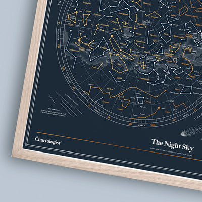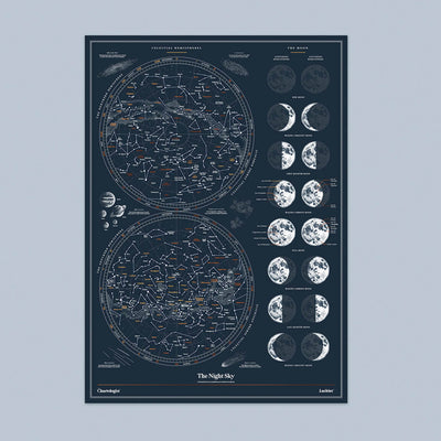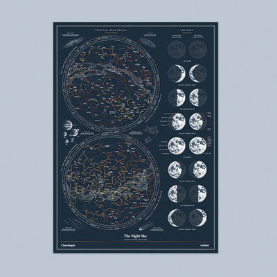 Sur cette page interactive Poster Chartologist Scratch du ciel nocturne Tu peux noter tes progrès en matière d'observation des étoiles. Les deux grandes représentations de l'hémisphère nord et de l'hémisphère sud forment le centre de l'affiche, et plusieurs constellations connues y sont correctement listées et identifiées par leur nom. Si tu as identifié une constellation en regardant les étoiles la nuit, tu peux gratter sa couleur dorée sur le poster à l'aide d'une pièce de monnaie et découvrir ainsi petit à petit tout le ciel nocturne. De plus, le poster complet contient une représentation détaillée des phases de la lune. Et si le temps se couvre plus longtemps : Le poster n'est pas seulement une carte interactive pour les amateurs d'étoiles, mais aussi une décoration originale pour les fans de l'espace et les passionnés d'astrologie.