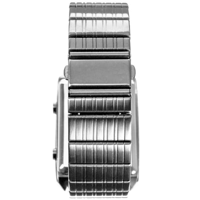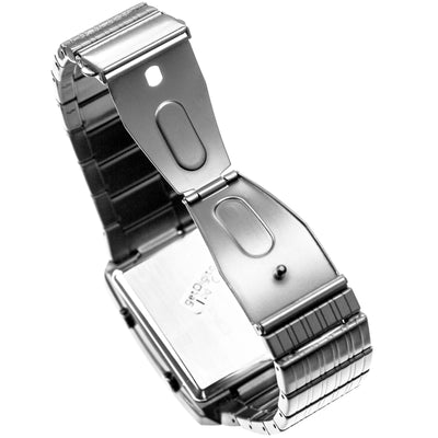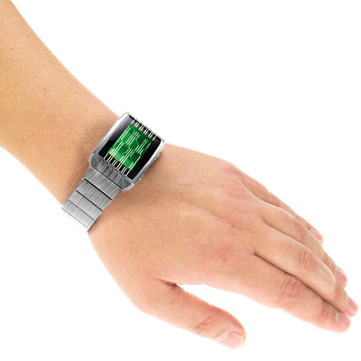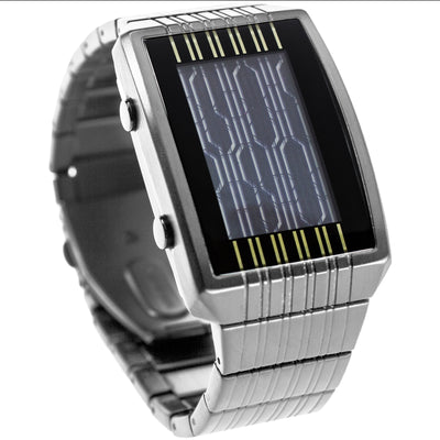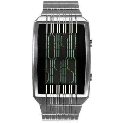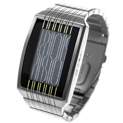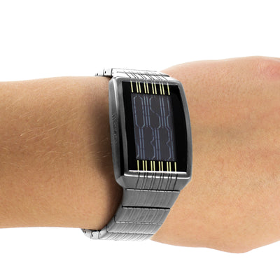 Des lignes verticales qui ressemblent à des signes cryptiques pour les non-initiés font de cet affichage de montre quelque chose de très spécial. Les chiffres représentés de cette manière ne sont pas reconnaissables au premier coup d'œil, mais pour les yeux entraînés, ce n'est pas un problème. Si tu fais bouger ton poignet d'un mouvement rapide, l'horloge passe à un mode plus simple, dans lequel l'heure se lit plus rapidement. La montre est dotée d'un capteur de vibrations très spécial qui permet cela. C'est toujours amusant de voir les regards étonnés des autres personnes lorsque tu lis l'heure sur un écran apparemment confus. :)
