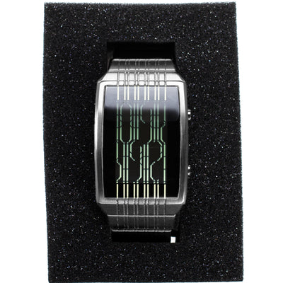 Le mode d'emploi facile à comprendre contient tout ce que tu dois savoir pour pouvoir lire même la version cryptée et t'aide pour chaque chiffre. Deux boutons sur le côté rendent le réglage de l'horloge, qui fonctionne en mode 12 heures, très facile et le rétroéclairage vert pratique te permet d'utiliser l'horloge à tout moment. Les regards ne manqueront pas de se poser sur toi, au plus tard en mode animation, où les différents segments de l'écran s'animent ! La date peut également être lue en appuyant sur un bouton et un mode alarme est également disponible.