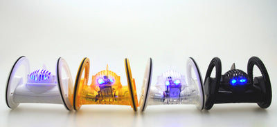 Nous proposons les Trekbots en 4 couleurs différentes. Comme chaque couleur a sa propre fréquence, il n'est pas difficile de les faire tourner en même temps ou de les faire s'affronter. Mais c'est le hasard qui décide de la couleur que tu reçois.
