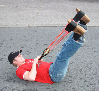 Le modèle "Solo" du lance-pierre XXL Wildsling peut être utilisé seul. Pour cela, il suffit de mettre tes pieds dans les boucles prévues à cet effet, d'insérer une bombe à eau, de tendre et de tirer. La bombe à eau peut voler jusqu'à 40m, donc plus loin que tout adversaire potentiel ne pourrait la lancer.