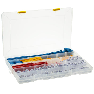 Die Stäbe mit unterschiedlichen Farben (blau (B), gelb (Y) und rot (R)) sowie weiteren Farben bei Themen-Bausätzen passen nur in ihre eigene Öffnung und sind in den Sets in jeweils drei festgelegten Längen enthalten: extra kurz (0), kurz (1) und mittellang (2). In den beigelegten Bastelübersichten und Anleitungen steht B0 dann z.B. für die blauen Stäbe in extra kurz, Y1 für gelbe Streben in kurz und R2 für rote Stäbe in mittellang.