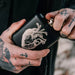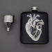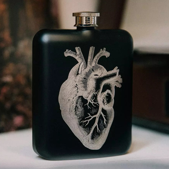 La flasque en acier noir est parfaite pour transporter une bonne goutte et peut être fermée avec un bouchon à vis. L'avant est décoré d'une gravure au laser représentant un cœur anatomique hautement détaillé.