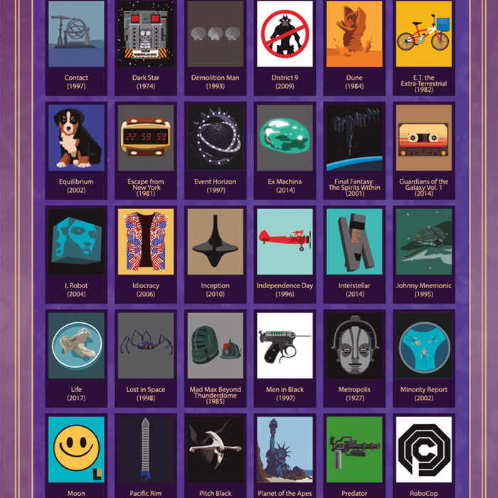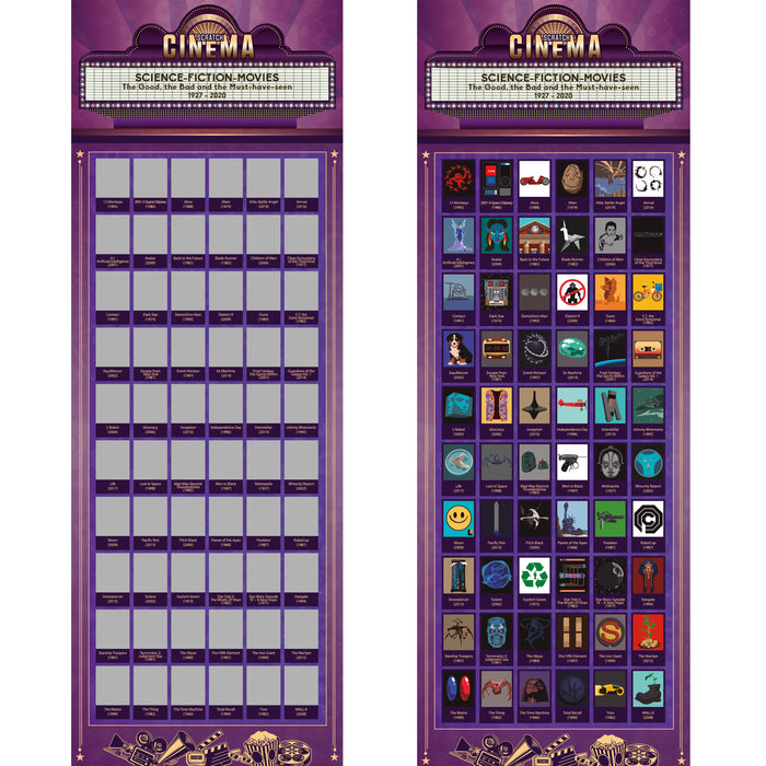 Les films explorent ces questions et bien d'autres encore sur le poster à gratter Films de science-fiction. Sur ce poster coloré, tu trouveras 60 films de science-fiction de A à Z - bon, d'Akira à WALL-E - que tu devrais avoir vus en tant que fan de science-fiction. Si tu as vu l'un des films, tu peux gratter sa case sur le poster avec une pièce de monnaie et révéler un objet ou un symbole du film.