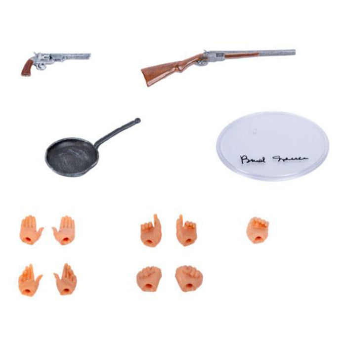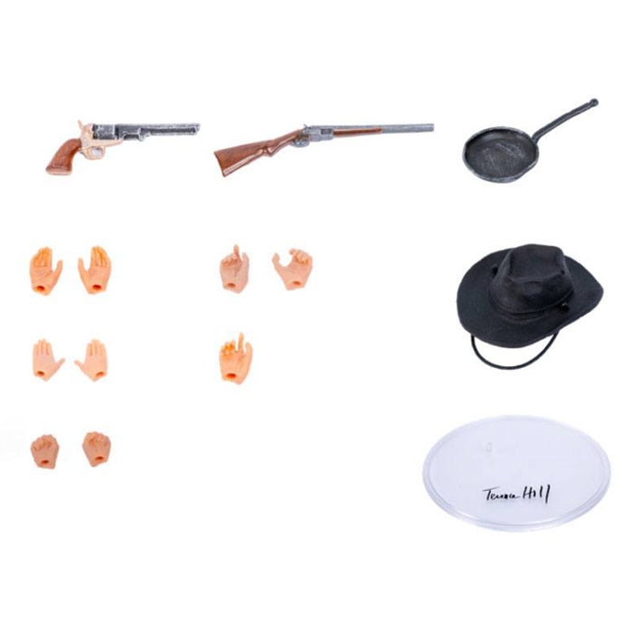 Ces deux figurines représentent les personnages Trinity ou Joe le fatigué (joué par Terence Hill) et Bambino ou le petit (joué par Bud Spencer) de ce classique du cinéma. Les deux se tiennent sur des plates-formes transparentes, décorées de la signature de l'acteur respectif. Et pour les deux personnages, il y a toute une série d'accessoires, dont un holster de pistolet, différentes armes à feu (et une poêle à frire) et plusieurs paires de mains interchangeables. Le personnage Trinity de Terence Hill porte également le chapeau typique. Les figurines d'action sont mobiles au niveau des "articulations" et peuvent donc être mises dans toutes sortes de poses.