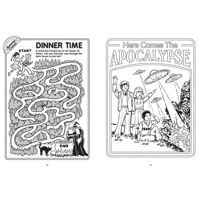 • Livre de coloriage conçu par Steven Rhodes dans le style rétro des années 70 et 80 avec des images et des activités amusantes et effrayantes