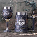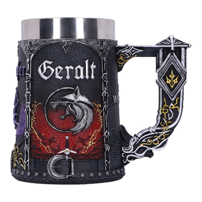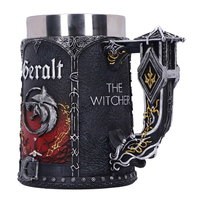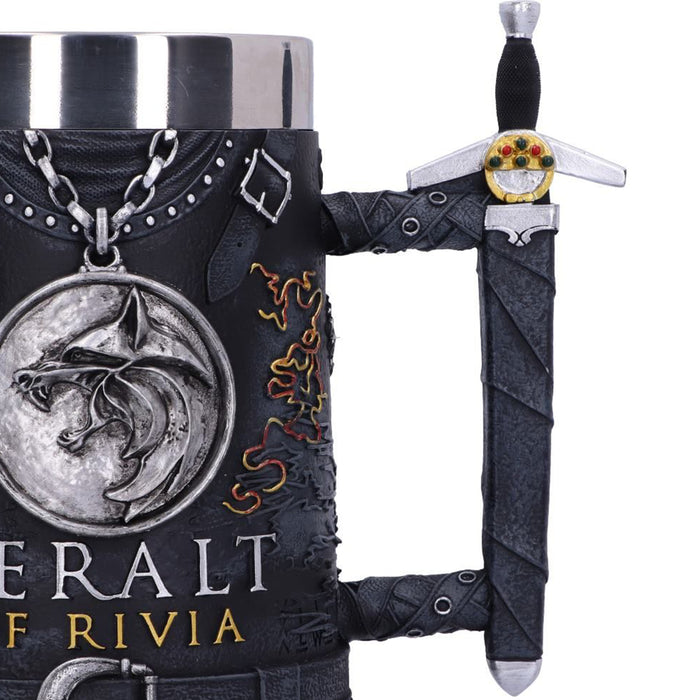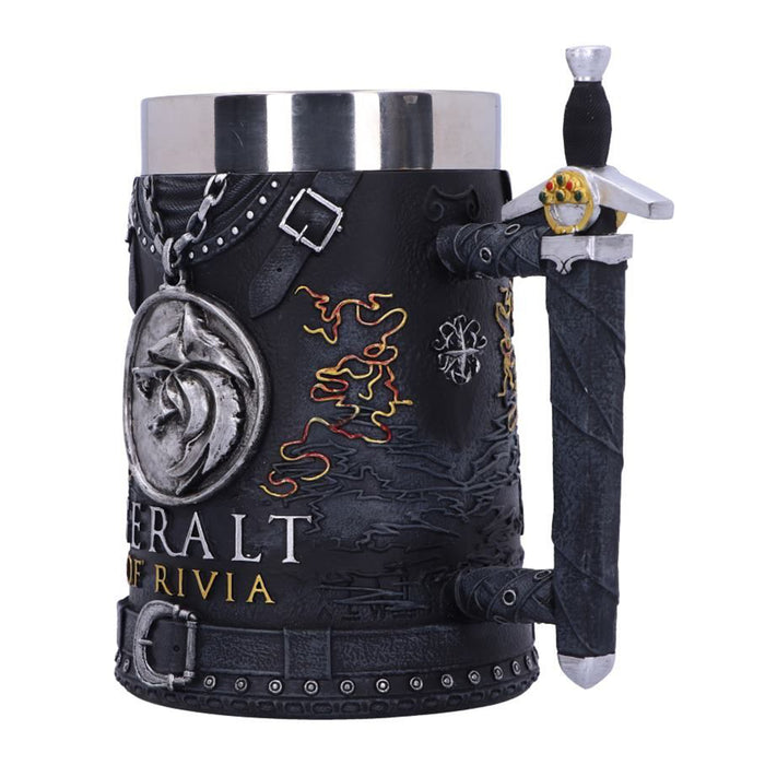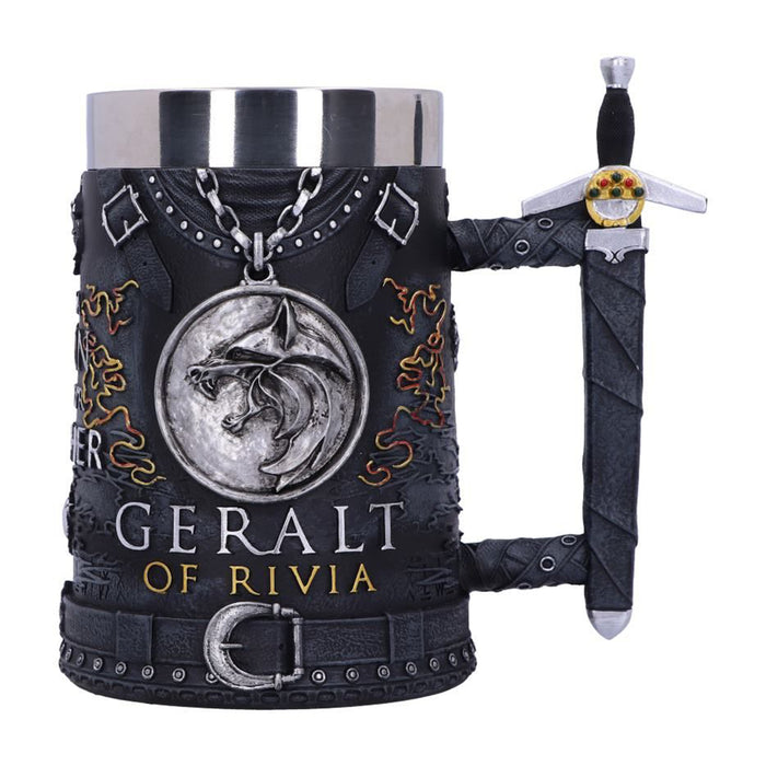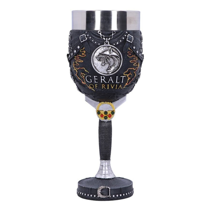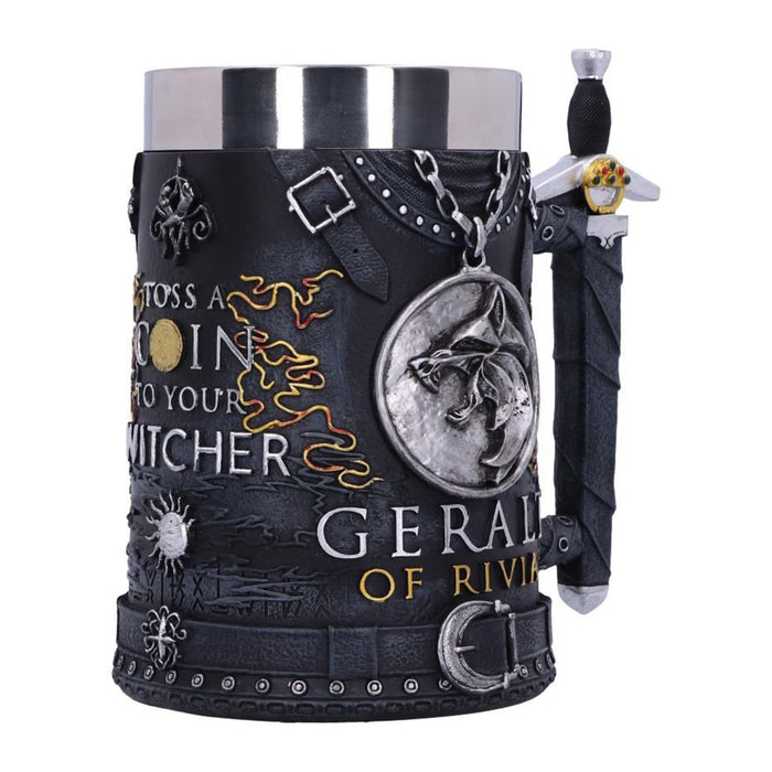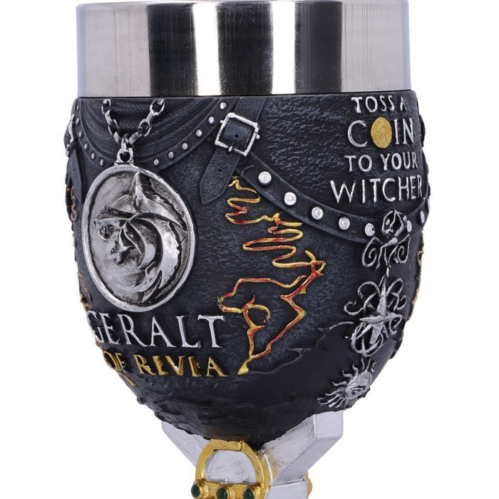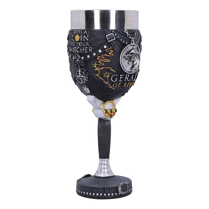 • Geralt est un mutant très frugal et ne refuse pas une coupe de vin blanc de Beauclair. Le récipient est conçu dans le style de son armure de cuir noir, avec l'une de ses épées en guise de manche. De plus, il montre bien sûr le médaillon du loup et l'inscription "Toss A Coin To Your Witcher".