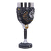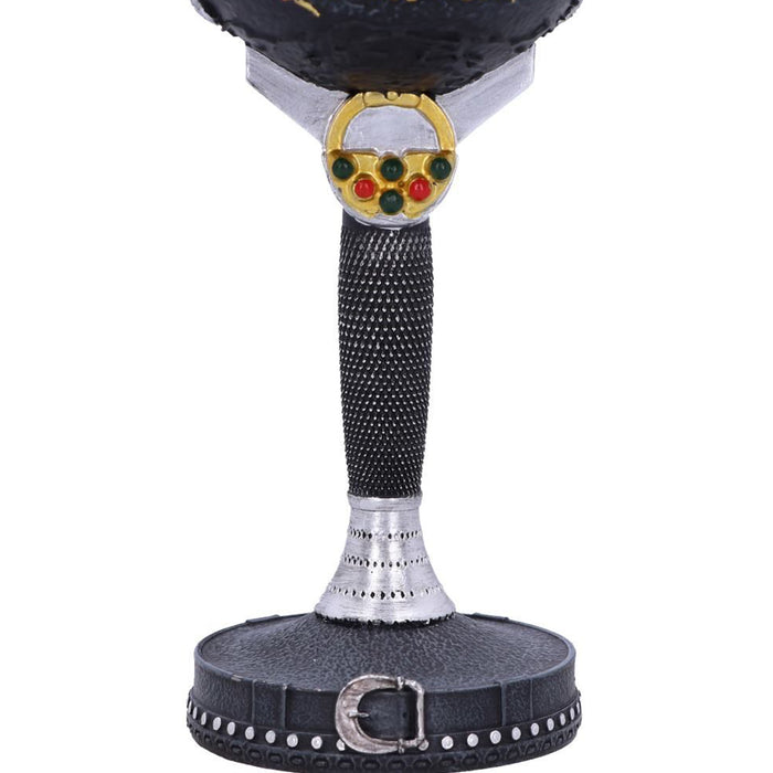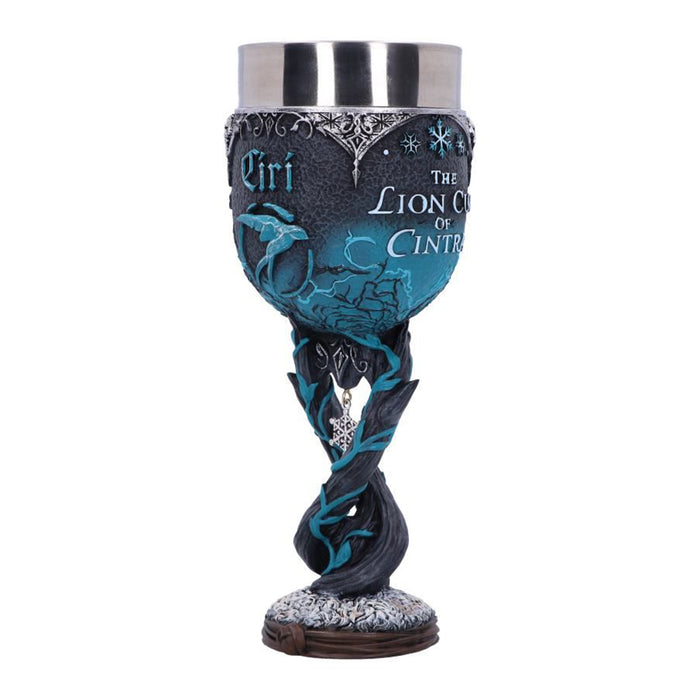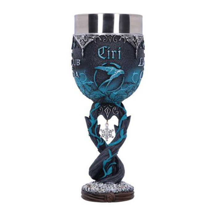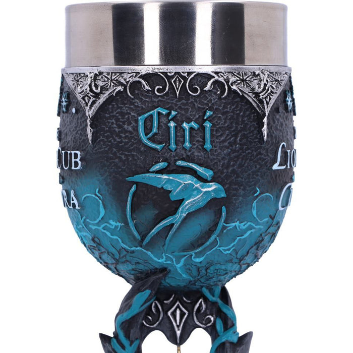 • La coupe à vin décorée de bleu, dédiée à la fille de Geralt, Ciri, présente le symbole de l'hirondelle et l'inscription "The Lion Cub of Cintra". Cela rappelle ses origines en tant que fille d'Emhyr var Emreis, même si elle refuse souvent de l'admettre elle-même. Un flocon de neige solitaire se balance dans la tige entrelacée de la coupe, en référence à la Chasse sauvage qui suit Ciri de près