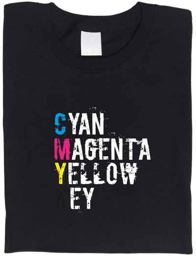 Una maglietta per tutti i designer: i nomi dei colori base dello spazio colore CMYK, utilizzato per i prodotti stampati. La K è visibile anche su una maglietta nera.