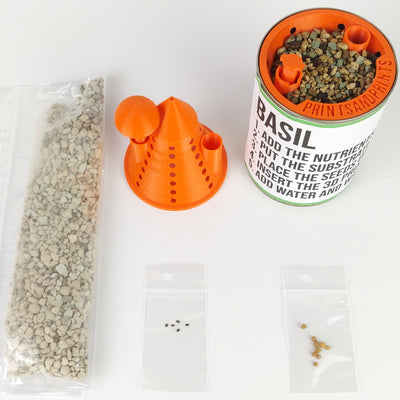 In diesem Set bekommst du alles mitgeliefert, was du für die hydroponische Anzucht brauchst. In die Dose, auf der auch die englische Anleitung aufgedruckt ist, gibst du den Dünger, der alle Nährstoffe liefert, die deine Pflanze zum Wachsen benötigt. Der wichtigste Teil ist der Siebeinsatz mit Wasserstandanzeiger. Er wurde mithilfe eines 3D-Druckers hergestellt und ist entweder orange oder rot. Dort hinein füllst du das Substrat und die Samen. Anschließend setzt du ihn in die Dose ein und gießt das Wasser hinein. Nun heißt es abwarten und schon bald hast du deinen eigenen kleinen Kräutergarten.