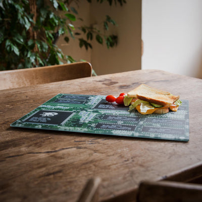 Perché ovviamente, anche quando giochi per ore e ore, hai bisogno di mangiare tra una cosa e l'altra. Tuttavia, vuoi anche circondarti di oggetti familiari in un ambiente sconosciuto. Ecco dove si trova il tagliere per schede grafiche è l'ideale! Poiché è realizzato in vetro e la stampa è sul retro, non si graffia ed è molto facile da pulire: l'acqua non intacca questo hardware. I pratici piedini in silicone assicurano che nulla scivoli.