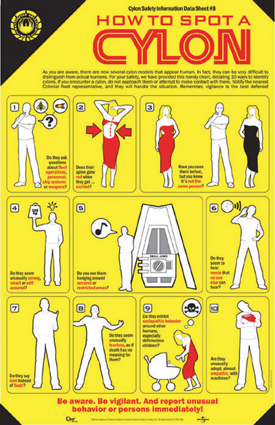Considera quanto può essere utile questa scheda informativa per scoprire i modelli di Cylon ancora sconosciuti. Non dimenticare che chiunque può essere un Cylon: Il tuo assistente, il tuo meccanico, il tuo sportivo preferito e persino un alto ufficiale dell'esercito delle Colonie. Ricorda che i Cylon ora hanno il nostro stesso aspetto. Sii vigile. E segnala immediatamente le persone insolite!