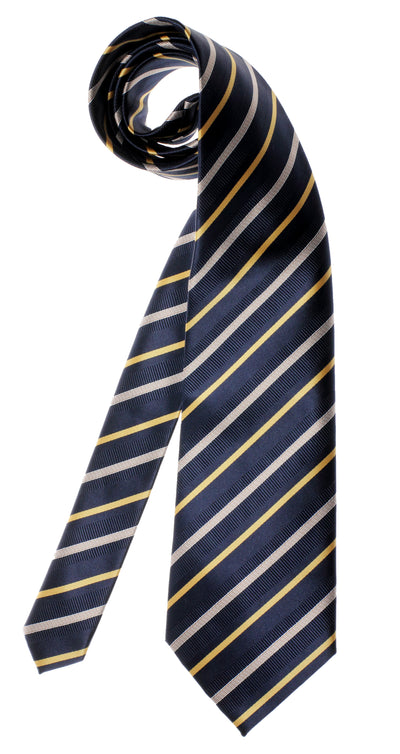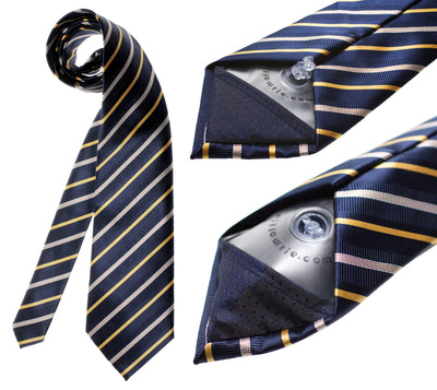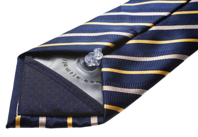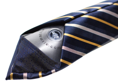 Prima di tutto, la cravatta cuscino è una cravatta molto chic con le classiche strisce diagonali in blu e giallo oro, per cui non dà nell'occhio in ufficio (a meno che tu non lavori da getDigital, dove tutti vengono al lavoro con camicie da nerd e felpe con cappuccio).