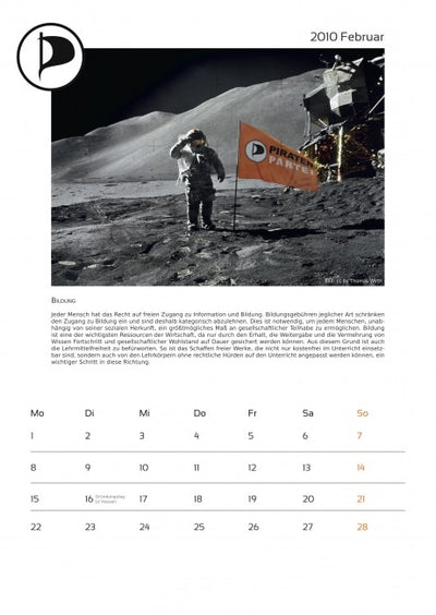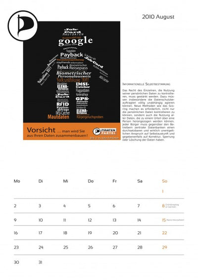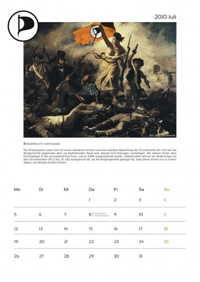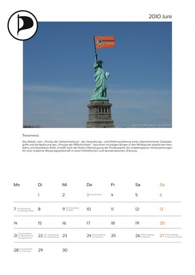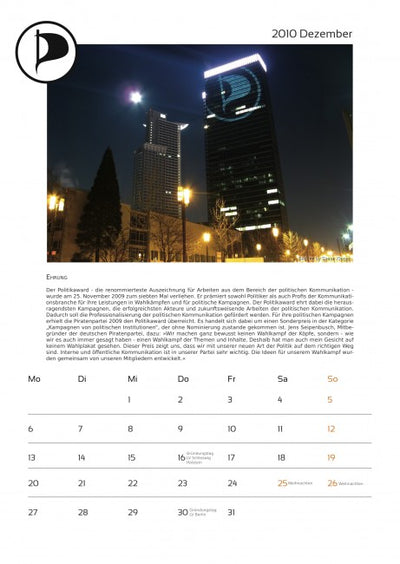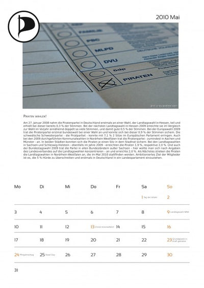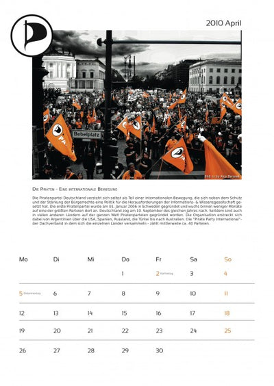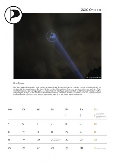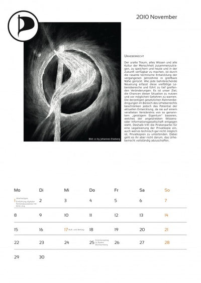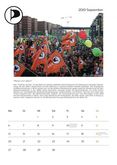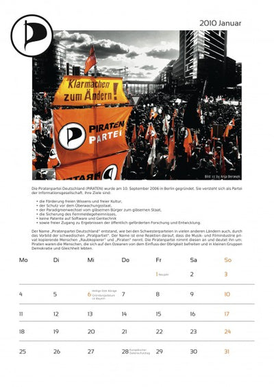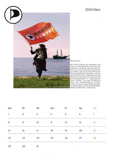 Ogni mese presenta un'immagine dei pirati e un testo sul tema dei pirati e il calendario contiene già alcuni eventi pirateschi. Un'ultima nota: a ottobre, purtroppo, abbiamo dimenticato di menzionare l'azienda che ha fornito ai pirati una macchina per le proiezioni, che ha beneficiato di un'importante sovvenzione. Vorremmo quindi ringraziare Oliver Bienkowski di Lightartist.