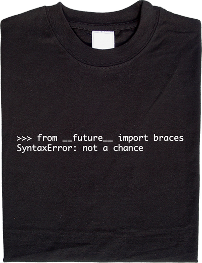Lo slogan di questa maglietta si riferisce a un'anomalia del linguaggio di programmazione Python: Python non usa le parentesi graffe per i blocchi di programma, cosa che molti oppositori del linguaggio criticano. I sostenitori di Python possono semplicemente rispondere a questo: Questo verrà introdotto presto, provaci: