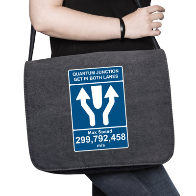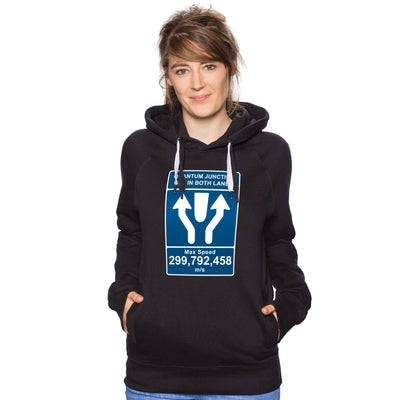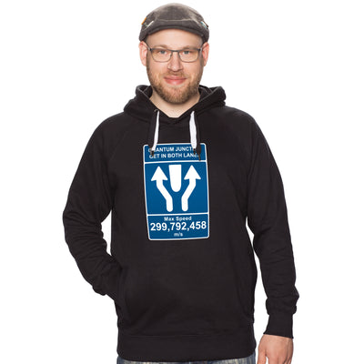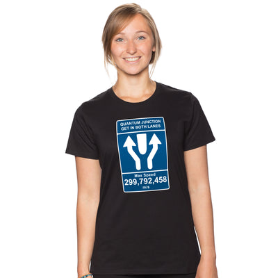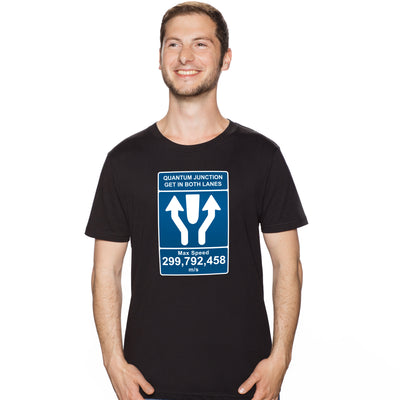 In questo caso, la maglietta mostra un cartello stradale, la velocità della luce e l'istruzione di immettersi in entrambe le corsie della strada allo stesso tempo. Si tratta di un'allusione al comportamento della luce nell'esperimento della doppia fenditura, in cui una particella di luce chiamata fotone viene proiettata in due fenditure. Invece di decidere a favore di una delle due fenditure, in determinate circostanze può accadere che il fotone passi attraverso entrambe le fenditure contemporaneamente! Per quanto riguarda il nostro cartello stradale, un'auto dovrebbe viaggiare su entrambe le corsie nello stesso momento e, a differenza dell'esperimento, questo sarebbe impossibile ed estremamente pericoloso ;)