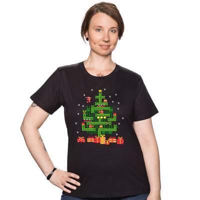 "È un me - Babbo Mario!" La maglietta "Super Mario Christmas Tree" presenta un originale albero di Natale disegnato nello stile pixel art dei classici giochi di Super Mario. La grafica pixelata ricorda i primi tempi delle console domestiche e conferisce al gioco un'estetica retrò e nostalgica. L'albero è composto da elementi tipici del mondo di gioco di Mario, come tubi verdi, blocchi con punti interrogativi e monete, ed è animato dall'iconico personaggio principale Mario con il suo costume da Babbo Natale, che si fa strada attraverso i livelli dell'albero di Natale superando Gumbas e Bob-oms. Ogni dettaglio dell'albero riflette i disegni e i colori caratteristici del mondo di Mario.