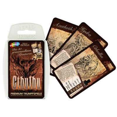 Per tutti gli aspiranti cultisti di Cthulhu, Azathoth, Shub-Niggurath o Nyarlathotep, raccomandiamo il Top Trumps Cthulhu, il super gioco di carte da briscolache non solo ti farà venire i peli sulla nuca, ma potrà anche migliorare la tua conoscenza dei grandi e minori Antichi.
