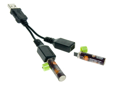 Con la batteria USB in formato AAA (1,2V, 550mAh), c'è spazio solo per una connessione più piccola, simile a quella di una mini-USB. Per questo motivo viene fornito un adattatore per USB. Una confezione contiene due batterie Ni-Mh. Il tempo di ricarica è di 5-6 ore e le batterie USB possono sopportare fino a 500 cicli di ricarica. Una luce blu ti informa sullo stato di carica.