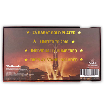 Welches bessere Item könnte es also geben, um Fallout: New Vegas gebührend (!) zu würdigen, als einen vergoldeten Fallout New Vegas Limited Edition NCR $ 20 Schein? Dieses exklusive Sammlerstück, von dem es nur 2010 Stück auf der ganzen Welt gibt, besteht aus geprägtem Metall und ist mit echtem, 24-karätigem Gold beschichtet. Der Schein bildet, ganz wie die Währung der New Californica Republic im Spiel, Ranger Seth ab und auf der Rückseite das Emblem der NCR. Der Schein wird mit einem Ständer zum Ausstellen geliefert.