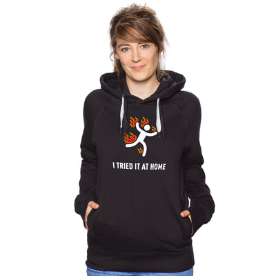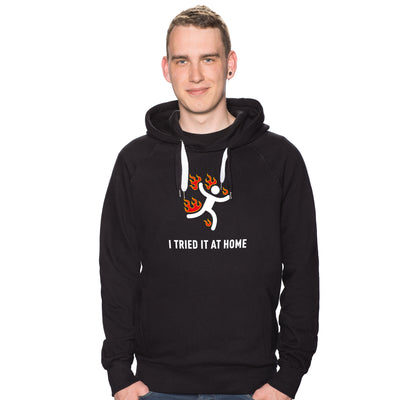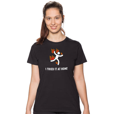 En het ding met het nadoen... nou ja, zie zelf: het "Ik probeerde het thuis"-T-shirt laat je vrij drastisch zien wat er kan gebeuren als je experimenten van tv of internet nadoet - je zou spontaan in brand kunnen vliegen en vervolgens schreeuwend rond kunnen rennen. Maar even serieus: zorg ervoor dat je jezelf niet verwondt tijdens het experimenteren thuis. 5 minuten internetroem zijn het niet waard om je leven en gezondheid op het spel te zetten. :)