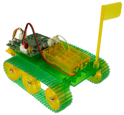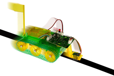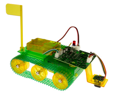 The Dark Line Tracer is a tank-like vehicle with a length of approx. 17.5 cm, which is characterized by its special line fidelity. If it is exposed to an easily recognizable, approx. 1 cm wide black line, it is able to recognize it and follow it faithfully thanks to its two light sensors.