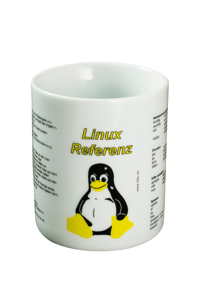 Op deze mok staan belangrijke commando's voor Linux afgedrukt, zodat je rustig met een kop koffie, thee of warme chocolademelk aan de computer kunt leren en oefenen.