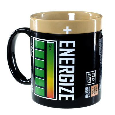 So wie jedes Gerät muss auch der menschliche Körper regelmäßig aufgeladen werden. Deshalb sollte man stets genug Batterien und Kaffee vorrätig haben, so kommt nichts ins Stocken. :) Nichts belebt so sehr wie eine heiße Tasse Kaffee. Dieser Becher visualisiert, was Du fühlst: beim Einschenken heißer Flüssigkeiten (Kaffee, Tee, Lava) füllt sich der Ladebalken der Batterie wieder bis auf 100%. Je weniger Kaffee oder je kälter er ist, desto weniger Energie verbleibt in der Tasse. ;)