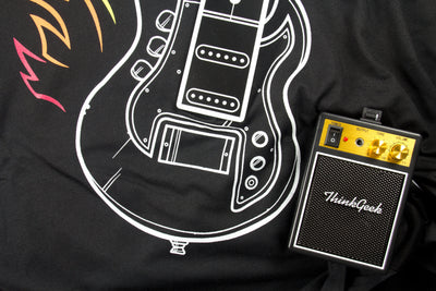 But seriously nowThe Guitar T-shirt is printed with an electric guitar in Gibson SG look (...the favorite guitar of AC/DC guitarist Angus Young) with a real playable fingerboard attached to the neck. This is connected to a classically designed mini-amp, which can either be stowed in the integrated inner pocket of the shirt or attached to the belt in a clearly visible position using the integrated clip. (For those who are not familiar with this terminology: It is an amplifier). The mini amp has an on/off switch, a 3.5 mm line-out socket (also for headphones) and rotary potentiometers for volume and sound.